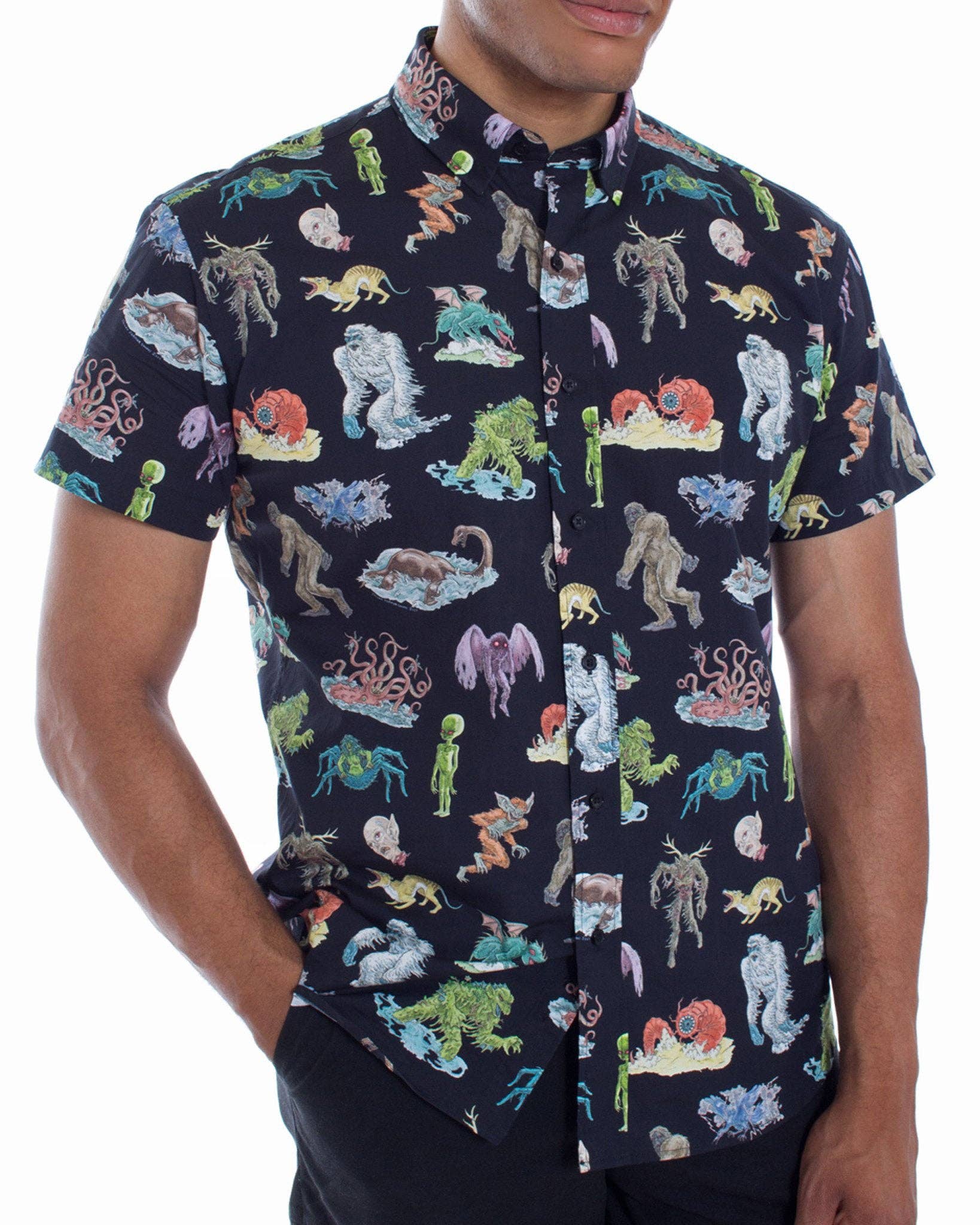 Cryptozoology has never been classier! Introducing this awesome button up short sleeve dress shirt. 100% Cotton poplin with a modern fit we spent years perfecting. These gorgeous cryptids are illustrated by Julian Farmar-Bowers just for Pretty Snake! All of your friends are here: Sasquatch, Bat Boy, Abominable Snowman, Mothman, Loch Ness Monster, Thunder Bird, Death Worm, Chupacabra, Gremlin, Alien, Swamp Monster, Jersey Devil, Thylacine and Wendigo. Plus Arachne, one of my favorite mythological creatures! The chest measurements below are taken flat 1” below the armpit. XS- 20.5” S- 21.5” M- 22.5” L- 24” XL- 25” XXL- 27” XXXL- 28” Our models Nic and Catherine are wearing a size XS (pics 2-5) and Kai wears a M (pic 6-8) P.S. Our shirts are machine washable! It says "Dry Clean Only" on the tag, but feel free to machine wash cool and dry low :)