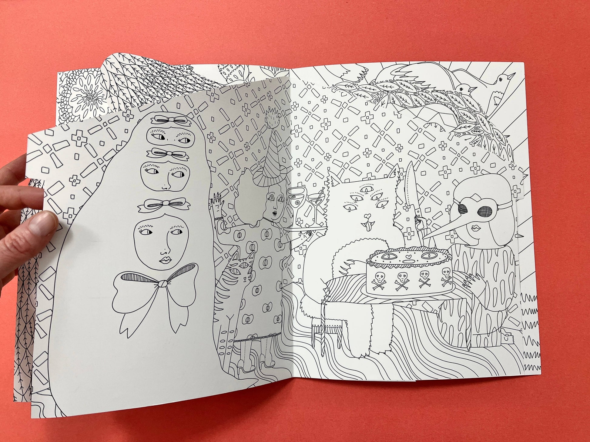 To the Witch's House We Go follows a group of people and creatures on their way to the party at the Witch's house in the woods. Many of the pages are cut by hand into different shapes for an interesting (and creepy) coloring adventure. It's printed on heavy 100 lb coverstock on smooth bright white paper. There are 20 colorable pages including the cover. When closed it measures 8.5"x11", open 17"x11".